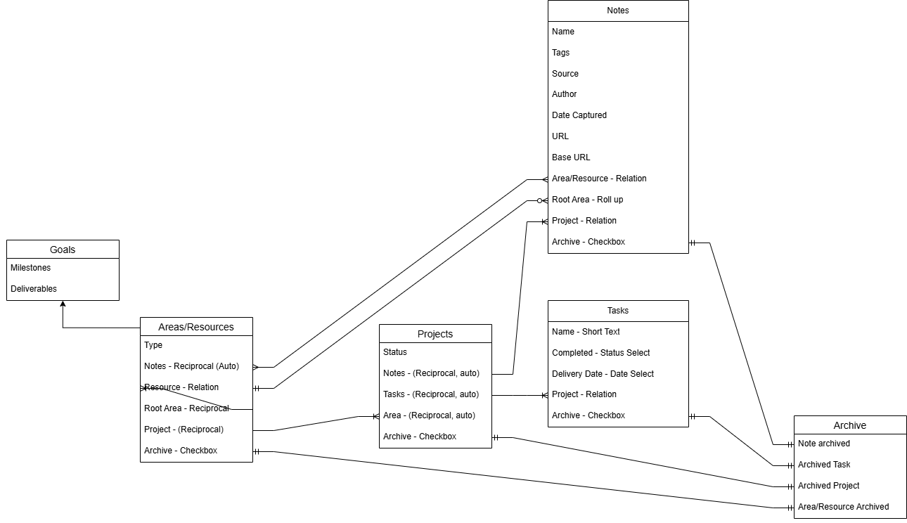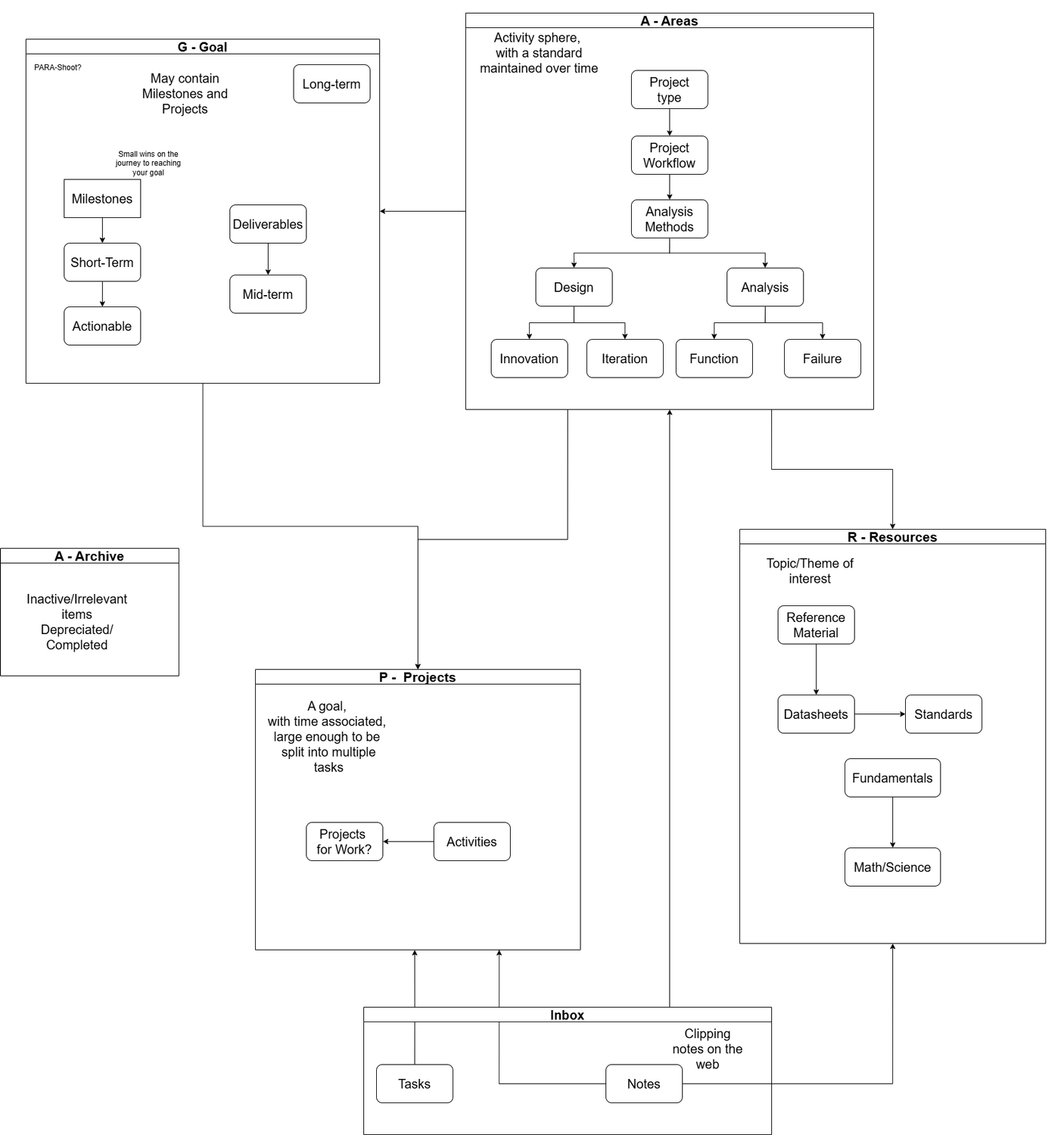 Many people have considered the first three as descending levels of actionability. Projects have active tasks and next steps. It’s what keeps you moving the needle forward. Areas have active projects, it’s a bird’s eye view of your priorities, business goals, application. Resources will be drawn from, and Archive is the chasm into which all unusable information may fall.